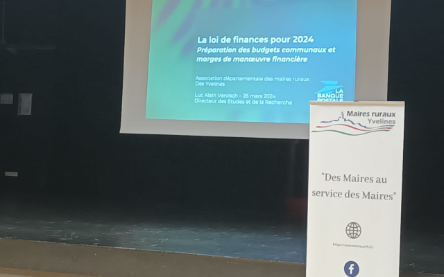 Ainsi, mardi 26 mars matin, dans la Salle Arc-en-Ciel de la commune de Mézières-sur-Seine, une trentaine de participants, maires, adjoints, DGS et Secrétaires généraux de Mairie, a assisté à la présentation de la Loi de Finances 2024 et ses conséquences pour les communes rurales, assurée de main de maître par Luc-Alain Vervisch, Directeur des Etudes et de la Recherche de La Banque Postale.